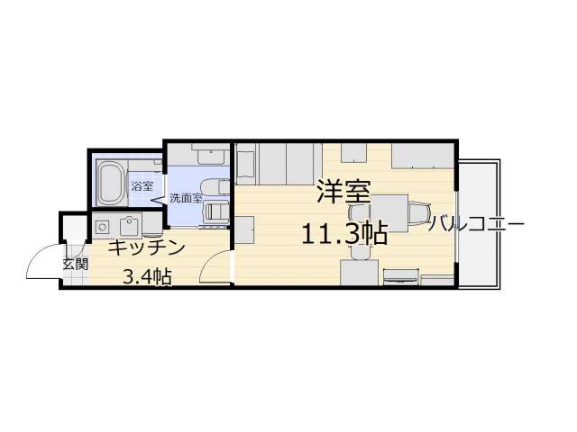 | 詳細間取 | 1K (洋11.3帖×1、キッチン3.4帖) | ||